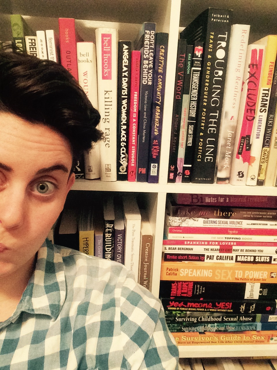 “Favorite books: Lost Boi by Sassafras Lowrey, Exile and Pride: Disability, Queerness, and Liberation by Eli Clare, and All About Love: New Visions by bell hooks. My bookshelf features that Autostraddle calendar from 2014 above (haha), also a lamp I got from the SOU Queer Resource Center when they were remodeling, my “grey flannel” candle #gaaaayy, and little to no organization.”