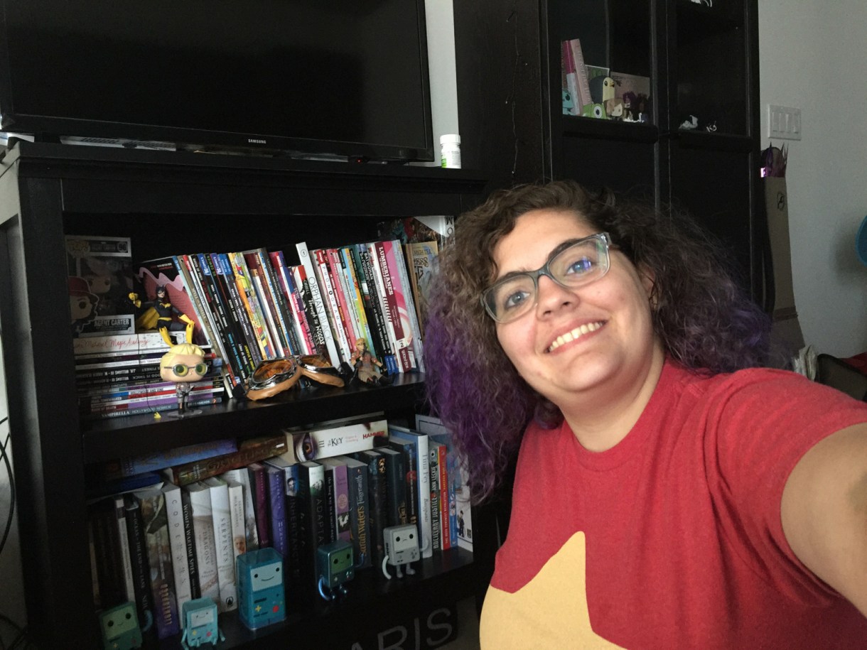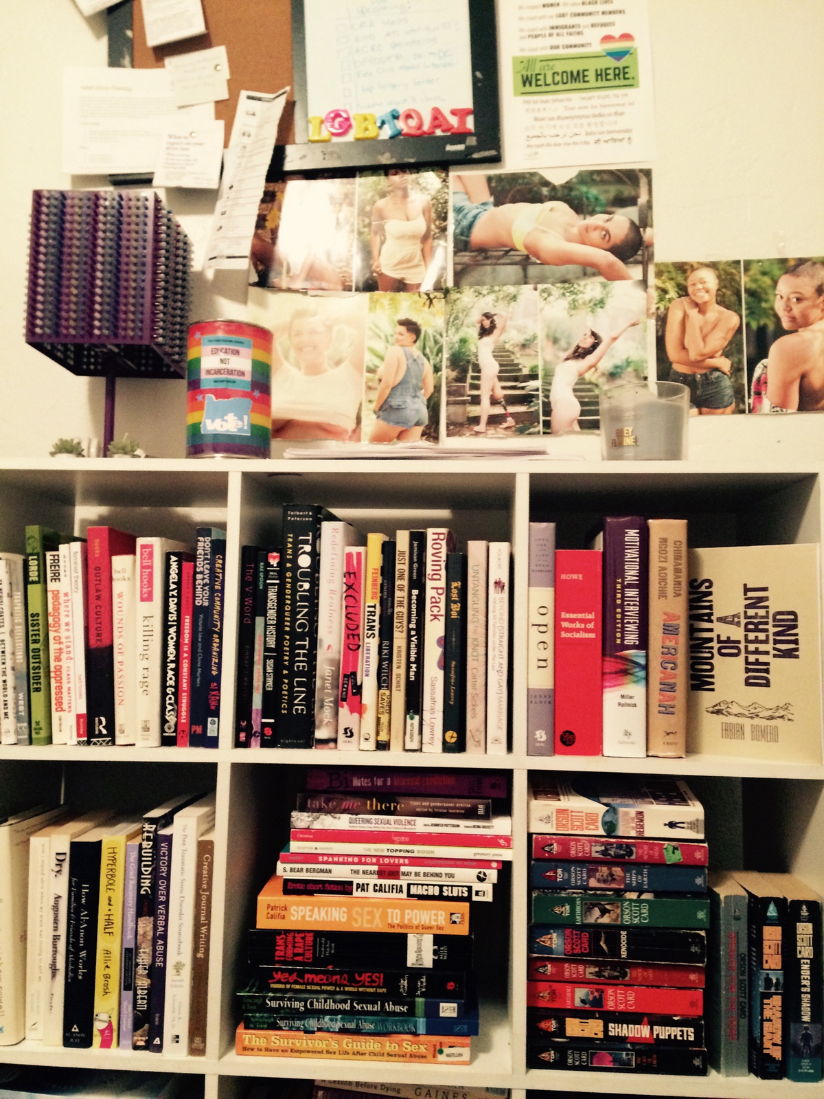 “When I moved into my house I couldn’t feasibly take my large bookcase with me. I currently have 3 small shelves that house my books, with the bookshelf pictured being the most recent addition. This bookshelf is my favorite because not only does it fit the majority of my books, but my cat can lounge on it and spy on the neighbors (cat not pictured — she was too cool to take a selfie with her mom). Half of the shelf is devoted to my queer book collection, which I began in 2000 with Tipping the Velvet. I used to organize my books by subject, then by author (an author with multiple books was then organized by publication date). I wasn’t as detailed with this new bookshelf, but I did separate queer from non-queer! My favorite book is Fall on Your Knees by Ann Marie MacDonald. It has traveled from home, to college, to the U.K., and back again. As much as I love my Kindle, nothing compares to the beauty of books.”