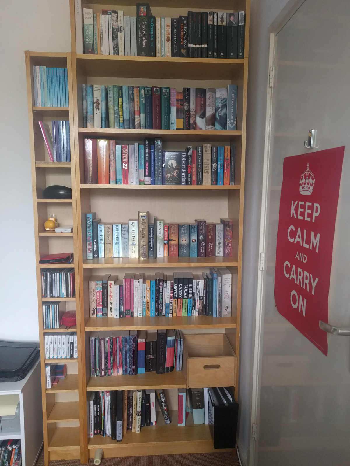 “I wouldn’t call my books strictly organized. There’s some books that I didn’t know where to put, so the Hitchhikers’s Guide to the Galaxy is hanging out next to a book named The Confused Guinea Pig. Roughly, the sections are English literature, beloved (Dutch) books from my childhood, sci-fi/fantasy, YA novels, Harry Potter, and on the final shelf there’s some comics. The Green Flower trilogy is my favourite thing on these shelves probably. It’s the coming-of-age/coming-out story of a 16-year-old boy in Victorian London, during the time of Oscar Wilde’s trial. My second favourite thing are my Hawkeye comics. Last year I wondered if I had lost the joy in reading, but since then I’ve discovered that I just needed to get my hands on fantasy novels with queer characters in them.