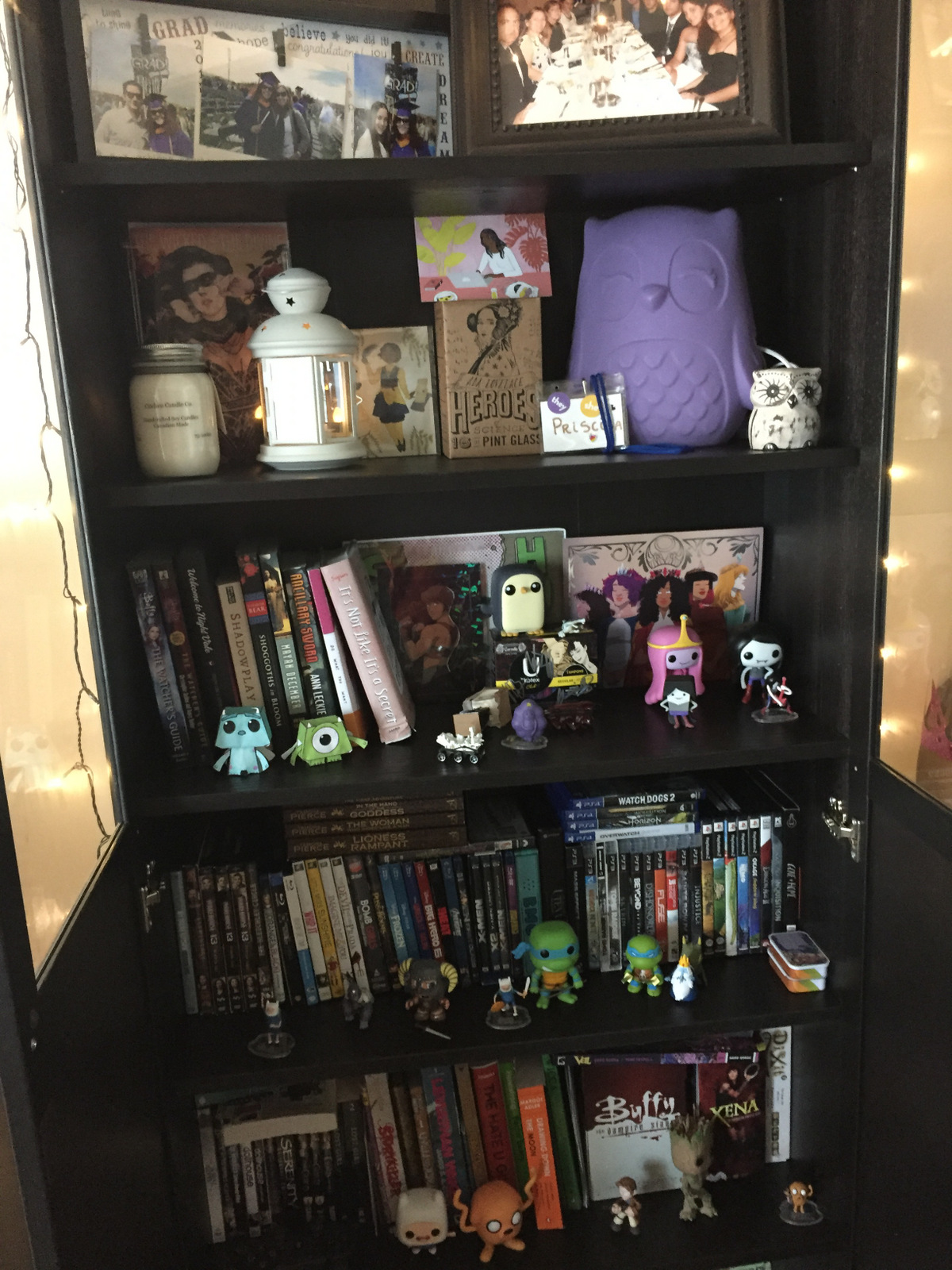 “My bookshelves are the central pieces in my living room/kitchen situation. They make home my home. I have my comics (I have to thank Mey for a lot of recs here) and my top books on display on the first pic, and whatever is left on the second pic. They aren’t really organized right now because I had to free up space for some visiting relatives, so I just threw the books back in for the picture. A lot of my books are back home because my parents kept getting mad at me every time I moved, so I just let them have them :( I won’t dare pick a favourite book, but I really love the Engelsfors Trilogy, which are Buffy meets Pretty Little Liars, and I’m re-reading them right now. (The Key is the third one in the series, visible in the first pic.) You’ll see a lot of random stuff and prints and funkos (and my A-Camp badge!) all over my shelves. The bookshelf in the first pic has been with me for a couple of years and I really love it. It even survived a move from the US to Canada. It is one of the few pieces I actually brought with me, I had to sell/give away most of my other stuff.”