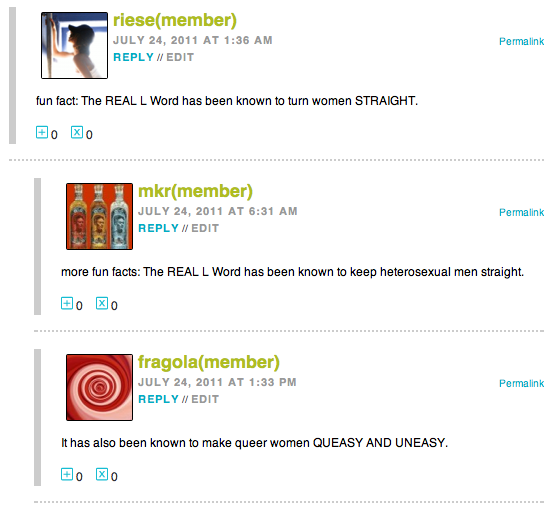 This was quite the roller coaster week, wasn’t it? We even had the open open thread so that everyone could comment away the blues. It wasn’t all low, though –there was plenty of cheer to go around in the form of shiny new autolikes from your adoring fans and fellow readers. Laneia introduced you to all the new writers and interns and we made some ice cream so that we wouldn’t melt. Lizz fashioncapped Pretty Little Liars as per ushe, Riese recapped another episode of your favorite show, The Real L Word and Jess brought you some background to the damn thing with her interview with Sadjah. Katrina made an appearance via an insightful and relevant to your interests update on what’s going on in runagay land and Bevin aka QueerFatFemme told you everything you didn’t know you needed to know about getting a prenup. Julie and Brandy In Your Box Office’d The Hang Over 2, the ladies of Unicorn Plan-It previewed The Ho Bag, and you can enter to win stickers and a voicemail from Haviland, Sarah, and Ashley. And if that isn’t a good ending to the week, I don’t know what is. Let’s turn it over to Brianna for the ASS Group of the Week.