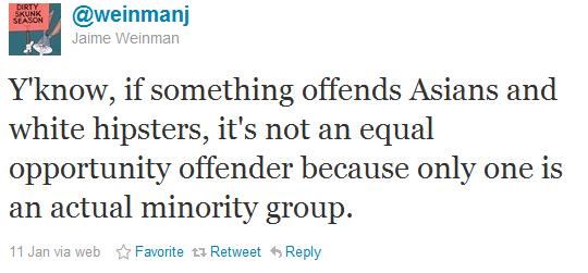 Humor is at its best when it’s making fun of everyone and no one at the same time. The jokes on 2 Broke Girls use one person to make fun of a group. The joke is aimed at Han and people like him and is to be enjoyed by everyone but them. When I think of my favorite comedies, the writers use the actors skills and preferences to inform the character then use those complexities to exploit the viewer’s expectations of  race, gender, and/or age. How can the actor accomplish that when the most important element he brings to the performance is that he’s Asian?