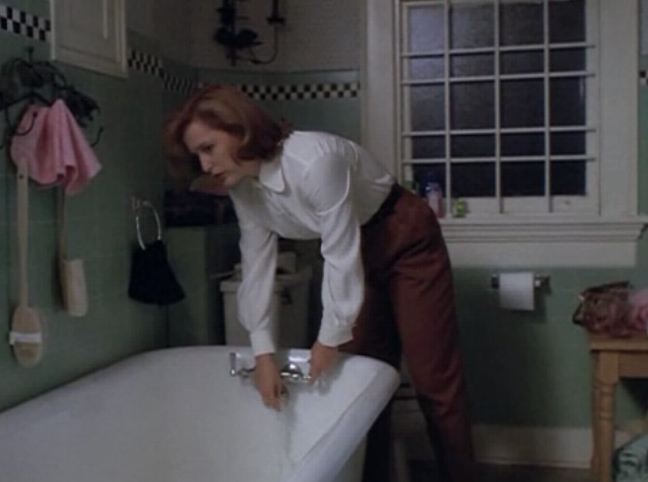 This is a classic. And by that I mean classic gayifying X-Files moment. This ep follows up on a Season One creeper, Tooms, who can stretch himself into small spaces and some shit. Naturally this is the PERFECT skill for watching women disrobe as they prepare to bathe. We see Scully enter the bathroom, turn on the water to run herself a bath, ready to proverbially let her hair down and wash off the day…and then goddamn Tooms ruins it for everyone. Someone get that guy out of the ventilation ducts and ship him off to Area 51. Creepy sonofabitch.