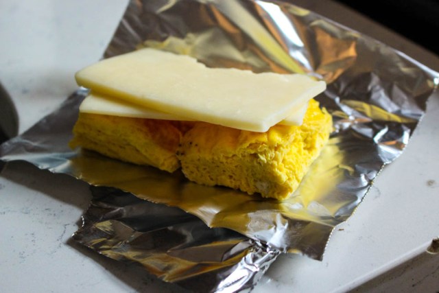 - Get your egg situation going – if you need to reheat baked egg soufflé, take it out and microwave it for like 25 seconds so it doesn’t stay cold in the center, and put any cheese you want on top. Stick it under the broiler in your oven or toaster oven. If you’re doing a bodega egg, crack your egg into a bowl, add a spoonful of water and salt and pepper and beat; heat a flat nonstick pan and pour in, throwing your slice of cheese in the center. Let the egg cook through and fold it over onto itself into a little square to fit the size of your bread, and flip over to let cook on the other side for 30 seconds.