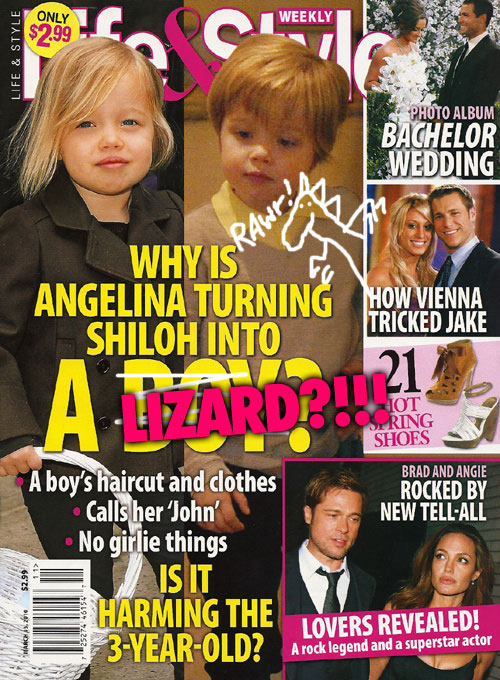 This incident is an example of a little something we like to call Shiloh Panic. The Editors would like to take a moment to define “Shiloh Panic,” named after Shiloh Jolie-Pitt, the royal offspring of Angelina Jolie and Brad Pitt, who are contributing to the moral degradation of this country by allowing their daughter to wear whatever she wants, which is alarming. Apparently.
