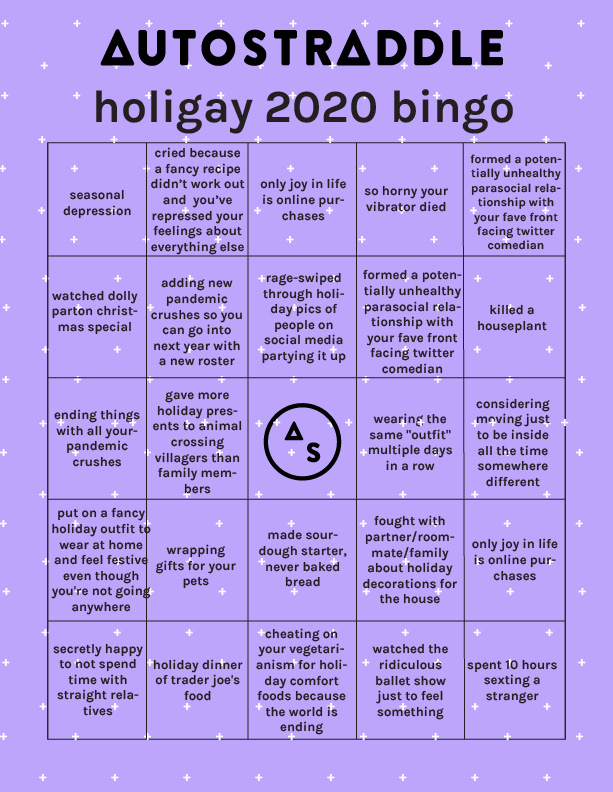 How many of these seasonal experiences do you share? You can tell us by screenshotting the bingo card below on your laptop or phone screen, marking off the ones that describe you in a visual editor of your choice (perhaps Preview, or the Markup option on your iPhone!) and sharing it in the comments here. Alternatively, you can share it on Instagram or Twitter and tag us (@autostraddle)! What do you win if you can make a bingo, you ask? I will close my eyes and concentrate very hard on telepathically sharing with you the experience of an honest-to-goodness hug, up to and including a small circular rub between your shoulderblades and a friendly cheek kiss as we release each other. Hoo, got a little lightheaded there just thinking about it!