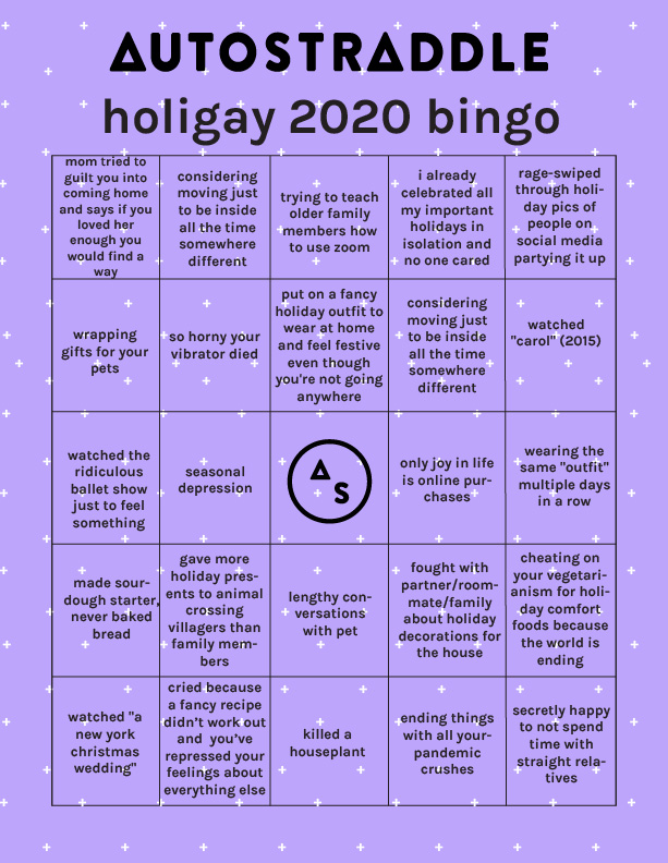 This A+ Holigay Bingo experience is part of the 13 Days of A+. From December 13 through December 25, we’re celebrating the people who literally keep our lights on, who believed we could make it through 2020, who invest and participate in this community through challenges and growth and change — that’s YOU. It’s truly magical to have so many guardian gayngels looking out for this space, and we’re so delighted to be able to do something a little special for our queer fam to close out the year. Some of what we publish for the 13 Days will be cozy and familiar, like Into the A+ Advice Box and Some Answers to Some Questions You’ve Been Asking Us. Some of it will be a twist on regulars; we have Malic White as a guest editor for two installments of the erotica series S L I C K for one… and the rest? We’re going to keep those pieces all boxed up in scissoring-patterned wrapping paper until they publish. We’re looking forward to spending some time with you.