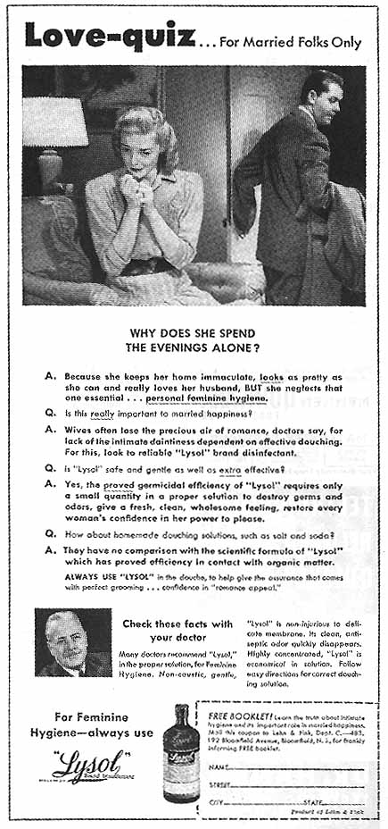 I can’t even imagine using Lysol as a contraceptive, let along as a cleaning solution for your uncanny va-jay-jay (as Freud / Oprah, “Froprah,” would put it). Not to mention that Lysol was using some pretty douchey (hah!) oppressive, partiarchical reasoning to get women to buy Lysol douches in the first place — many of their advertisements from the time adhered to several themes: