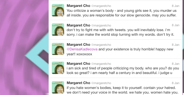 About the post more generally: I remember my dad making fun of my stretch marks when I was about 11, which took me a long time to get over. I also remember him informing me that one day I’d want to have the skin abraded off my face to hide the chickenpox scars I hadn’t even freaking noticed until that point. Jerkface. So yeah, good for Margaret Cho for not sitting back and taking it. If people think you should just ignore people being assholes on the internet, then people should similarly not be upset with her for rightfully raging back at them.