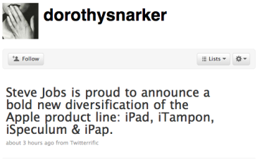 Also, I’d like to formally announce some kind of iPad joke competition here, because now that everyone got that first wave of jokes out of their system, making fun of the name got kind of hard.