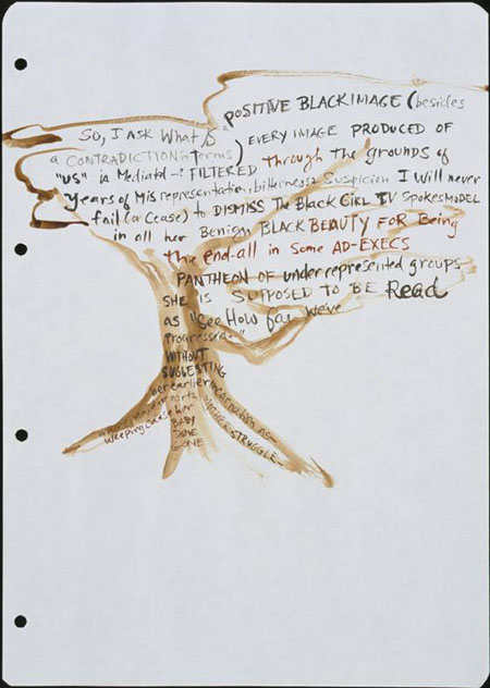 Though Walker is best known for her cutouts, she also continues to produce drawings, paintings and text based work. Her 1997 work, Do You Like Creme in Your Coffee and Chocolate in Your Milk?, consists of 66 pages of drawings and texts largely on traditional 11-5/8 x 8-3/16 paper. Walker created the piece during her first pregnancy as a diary style response to criticism from other black artists who who felt Walker’s artwork promoted stereotypes and that she was unfit to receive a MacArthur fellowship.