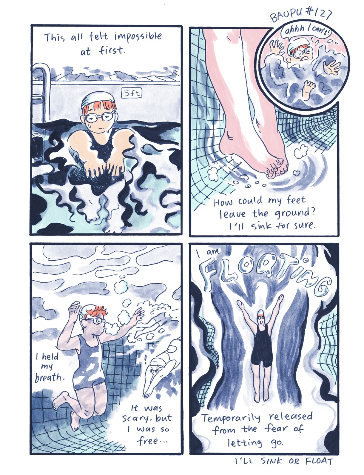 I think this is my favourite Baopu comic yet. I am an avid swimmer and just adore how you captured the pool (the light reflecting, the almost-touching the tiles, the swirling of the water, I can basically smell the chlorine!!) as always the poetry accompanying the images works wonderfully, too.