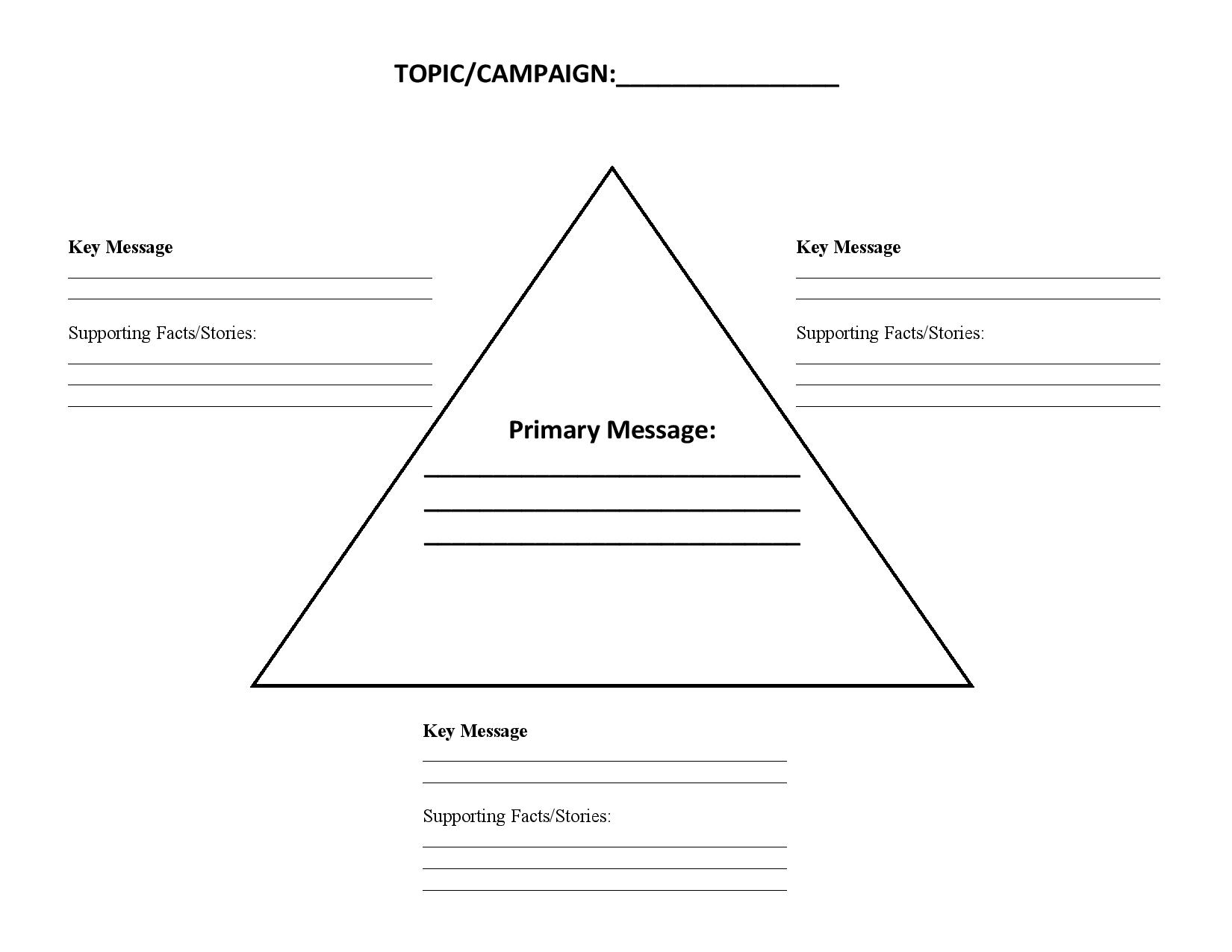 It works like this. You put your primary message at the center and then three different key message points around the sides of the triangle, with supporting facts, stories, examples, and messages to support each key message point. Key messages should be brief—only one sentence and in plain words.