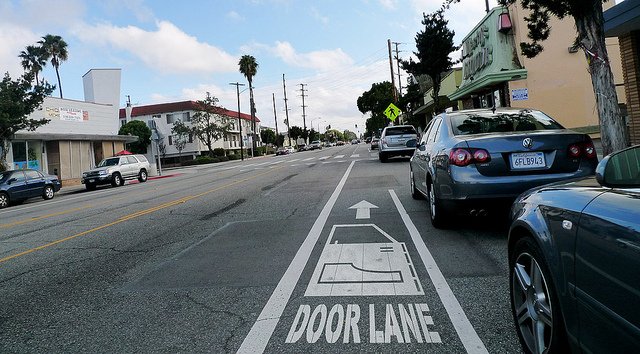 Be especially wary when cycling alongside parked cars, lest you get “doored.”