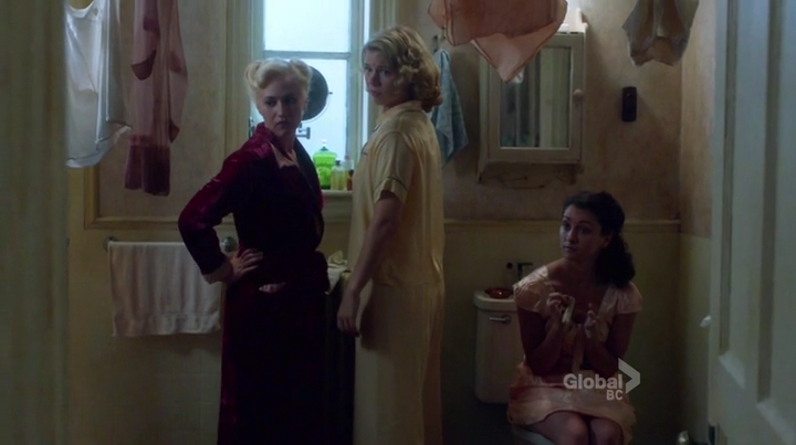 Gladys says she’s moving out of her totally lame parents’ place, and will be crashing with the girls at their giant lesbian commune/boardinghouse for a while. Betty and Kate are like “Okay right well I hope you like quinoa.” Gladys goes to take a long diva soak, only to discover the joys of communal bathrooms. Numero uno on my list of things I do not miss about dormitories.