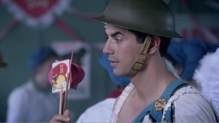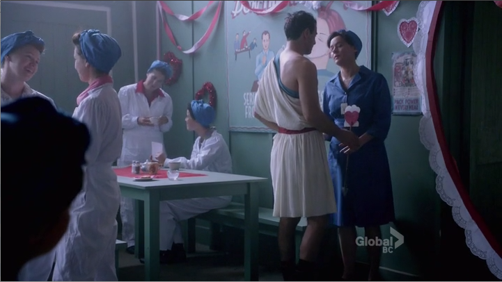 Down in the canteen, Marco the Italian Stallion comes busting out of a heart football team style. I can’t make this shit up. It’s Valentine’s Day, and apparently the factory does not fuck around with Valentine’s Day because the decorations alone are pretty intense. Somehow in wartime they have found the budget to outfit the men in fairly elaborate togas and wings? Victory Munitions, your priorities are adorable.