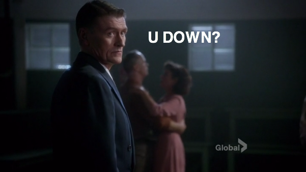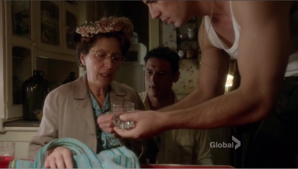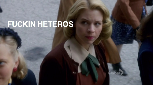 Meanwhile on Chilly Housewives of Toronto, Lorna and Reggie are reading the morning paper and refreshing Hulu to see when the new episode of The Daily Show will be online. After hearing Jon Stewart’s bit about the Nazis taking down a civilian ship in Newfoundland, they are interrupted by the milkman, with whom Lorna is sharing a weirdly erotic moment. Did I mention the moment was erotic and weird? She gives him a hard time about where he leaves the cream, and the amount of tension is disturbing. Lorna literally says “naughty neighbors steal my cream.” Bomb Girls: the show that continues to go there even when you are not sure that’s a place you want to go.