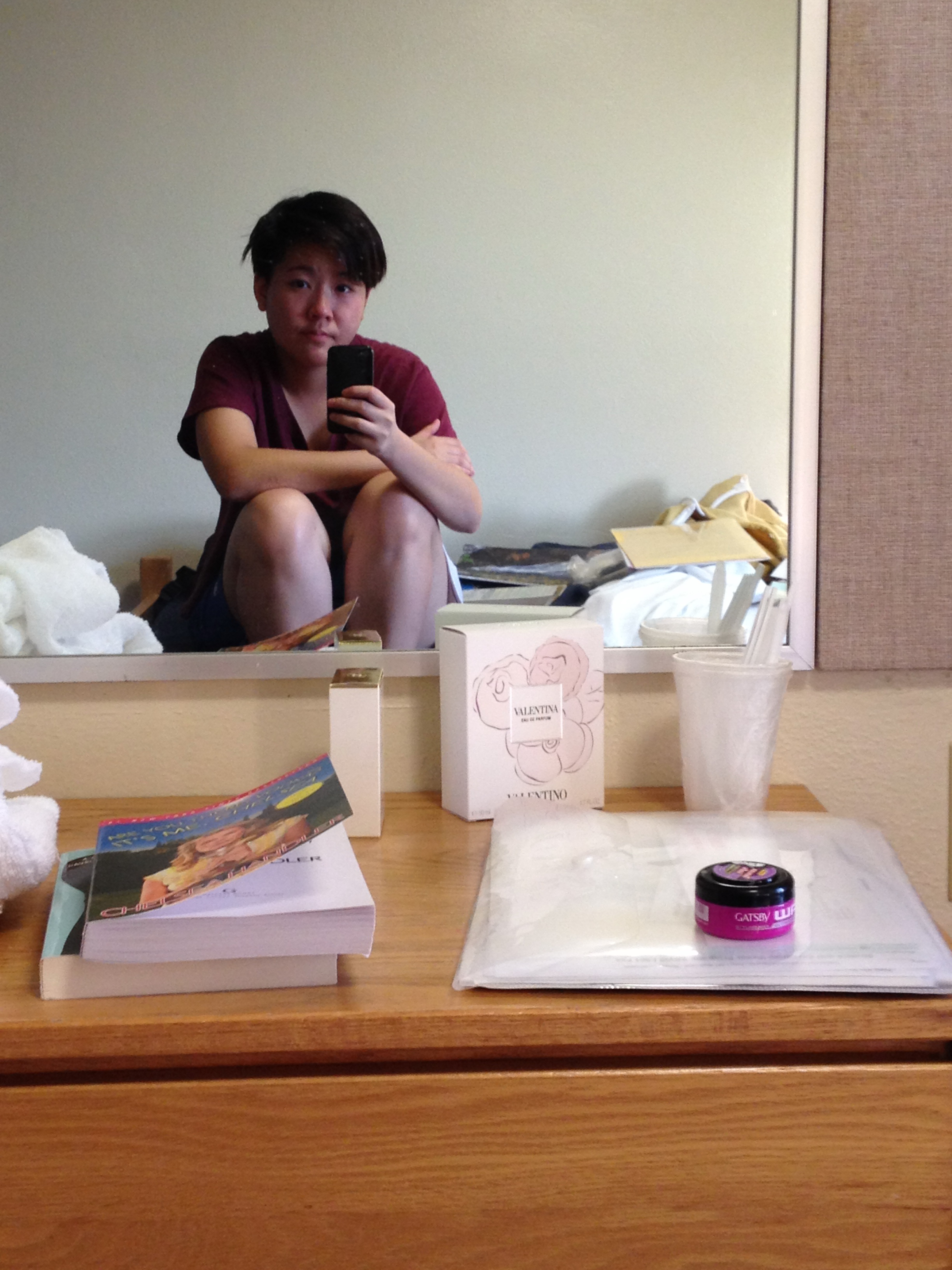 I hate to admit it, but on the first day I arrived in Ithaca College, I sat on the floor in silence for half an hour, hugging my knees as my eyes welled up with tears. Here is a photo of me on that day (on the desk are two Chelsea Handler books I bought to cheer myself up):