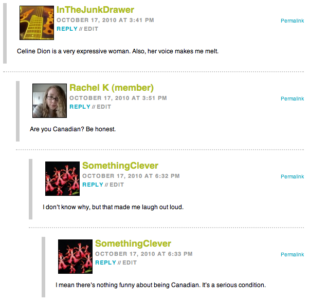 Not quite sure how to feel about my first comment award being a result of my non-Canadian appreciation of Celine Dion and being called out for probably being Canadian. Even though I’m not. *shrugs*
