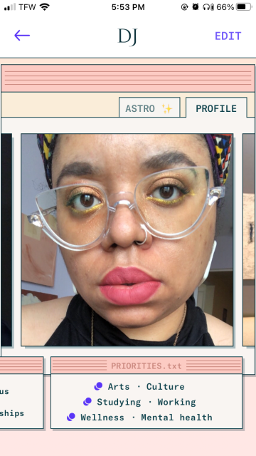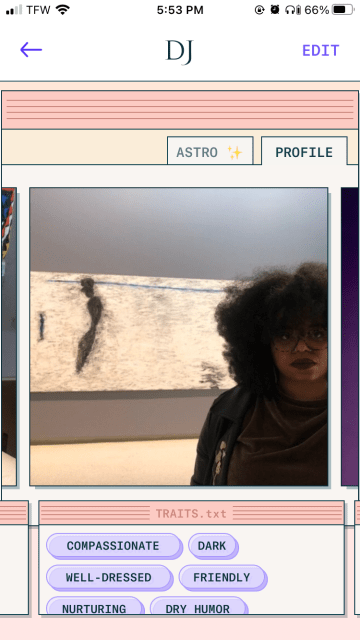 Dani Janae: I’ll also agree that I hardly talked astrology. I would look at someone’s chart to see why the app thought we were compatible but that was it. I also loved how chill it was as Drew mentioned. Only four potential matches for whatever period of time? Very cool. I had to adjust my parameters a lot to get matches though.