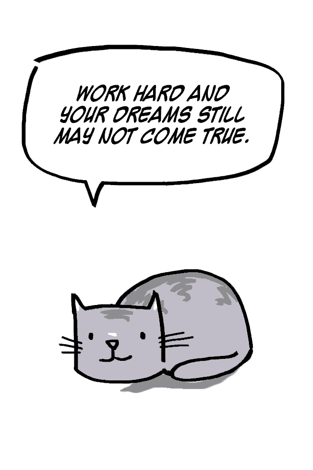 I’m not sure what it is – perhaps it’s the sullen turned back of the brown cat as he informs me of my body’s deterioration. Perhaps it’s the earnest smile of the grey kitten as he tells me what elementary school never did: that hard work does not guarantee dreams (which is really also a comment on privilege and class). But somehow these are incredibly funny even in their dark sentiments. Really, I just felt you should know these existed and to have a good teeth-gritting, sad-but-true laugh. Happy Monday.