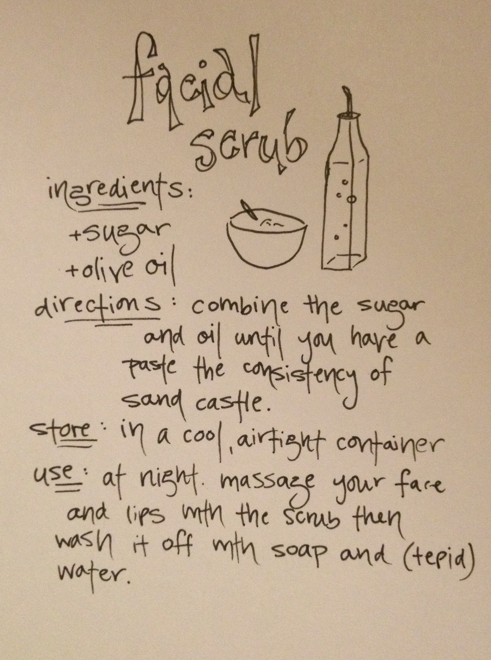 This scrub is best to use at night because the oil washes off dirt and makeup and the sugar gets rid of dry and peeling skin. Take a dab the size of a quarter and massage it into your face in an upward motion. First your chin and cheeks, then your nose and lips, then your forehead. Use soap and lukewarm water (hot water can dissolve the sugar, leaving a sticky mess on your face) on a washcloth to wash it off. Don’t let directions stop you from being creative, though! Try it on your feet, elbows, legs, or whatever body part needs a little bit of help in the smooth skin department.