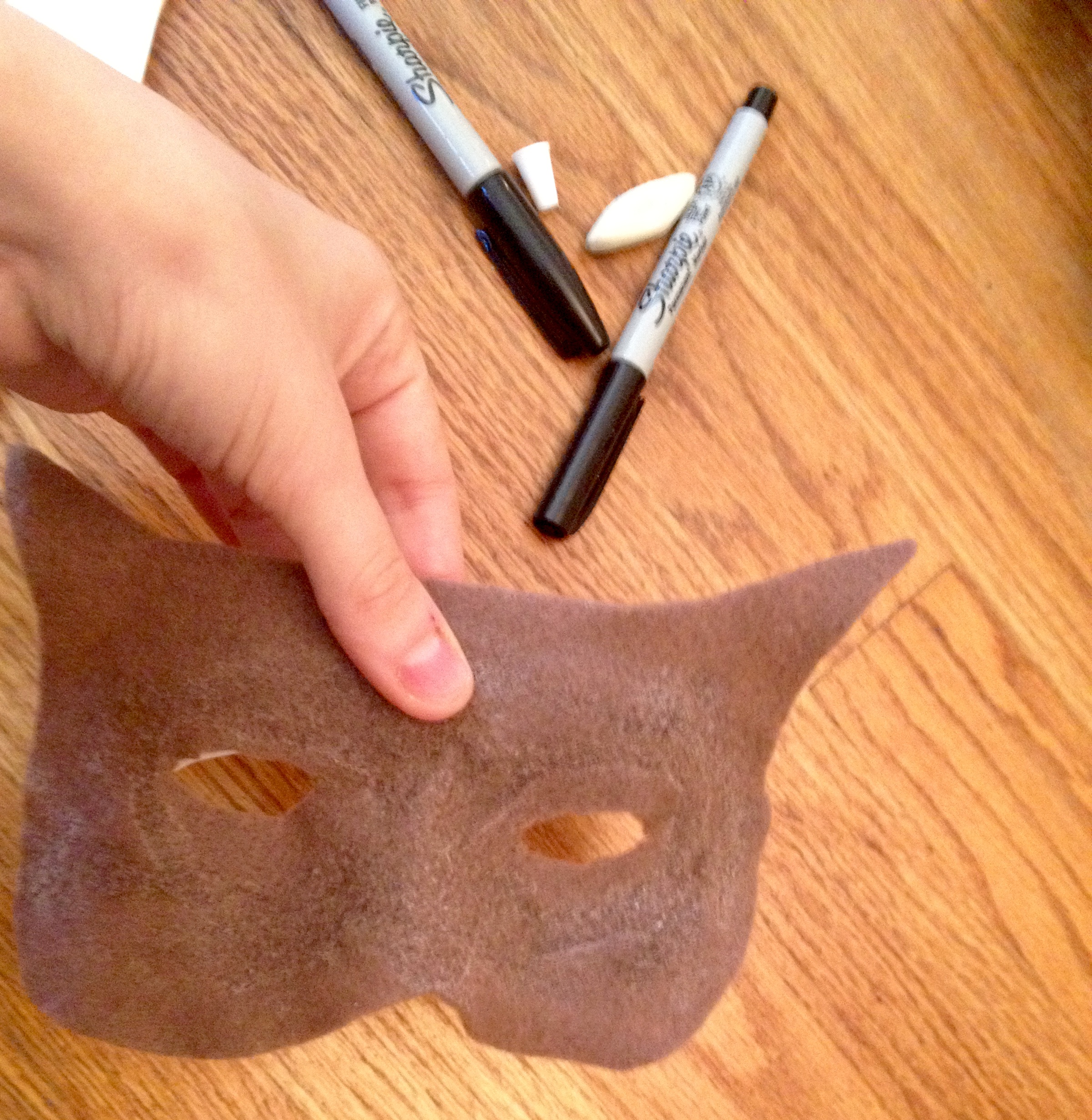Cut the shape you just made out of brown felt, and glue it down to the mask. Make sure it’s pressed down into all the mask’s various curves. I made one in light brown and one in dark brown.