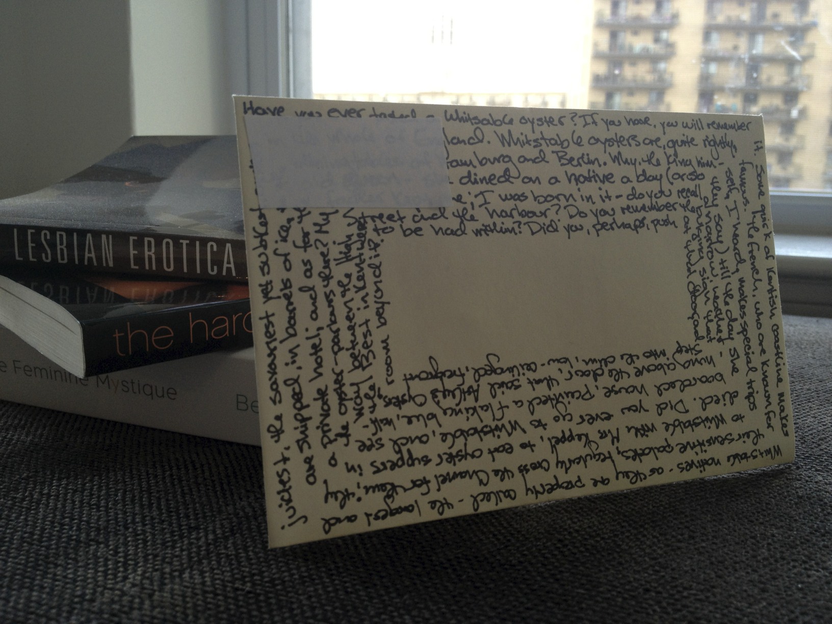 Choose a page or two from your Very Gay Book (I chose Tipping the Velvet.) Start from the top left corner and write your copy fairly small along the top edge. Leave a small gap when you get to the corner to avoid future word crashes, turn the envelope and continue to write along the edge. Wash, rinse and repeat until you wind up with a border of gay words surrounding a clear square in which to write an address.