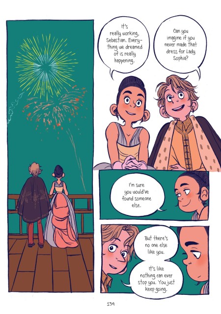 The Prince and the Dressmaker tells the story of Frances, a young seamstress who dreams of being a great dressmaker and fashion designer. She has a knack for knowing exactly what her customers want and a flair for the extravagant and dramatic that sometimes gets her in trouble. But it’s also exactly what catches the eye of a mysterious new client who hires her fulltime as a personal dressmaker. It’s not a spoiler to say that this client is the titular Prince, a sensitive and stylish teen named Sebastian who has a secret — he likes to wear dresses and become a different person sometimes. With the help of Frances and her dresses, Sebastian fully discovers this other person, the trendsetting Lady Crystalia, and she starts to go out more and more, becoming one of the biggest influencers in young women’s fashion. What follows is a story about identity, fashion, feeling comfortable as yourself, loving who you really are, and loving others for who they really are.