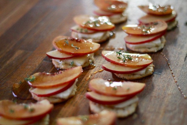 I didn’t even try to make it in kitchen cause I knew it’d be a better look for me if they could see the progress and promise of the food up close in real time, so I grabbed my cutting board, knife and all the ingredients, then set them in my lap and sliced and assembled these saving grace fruit and cheese crackers right there on the couch while they watched in silence. It was intrigued and anticipatory silence though, so I knew I was good. I layered the sharp, creamy, biting cheese with juicy peach and crisp apple slices, drizzled them lightly with a bright citrusy olive oil, and sweet floral honey, then finished with a little thyme for fresh earthiness and flaked sea salt to really bring out all the flavors.