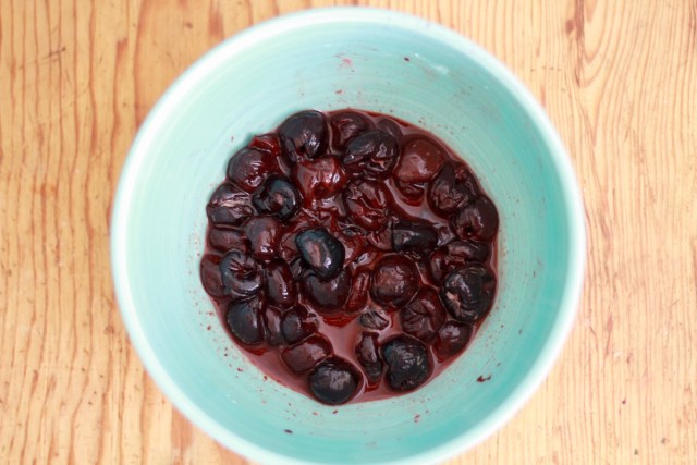 Now add in the cherries, stir everything together, cover the pan and cook for 8 minutes remembering to give it a good stir every 3-4 minutes. When it’s done things should be hot and soft and bubbly and the juices should be thick and syrupy.