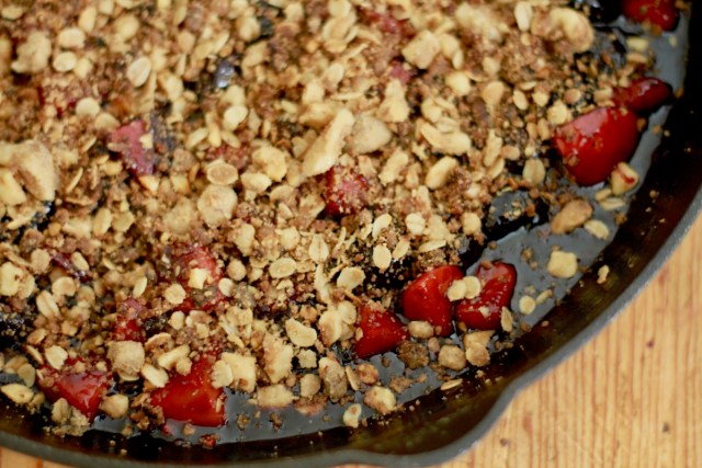 Once it’s done turn off the heat, top it (I hope someone is enjoying the number of times I’ve said top in this post) with the crumble mixture, and serve. I like to serve it straight out of the pan…