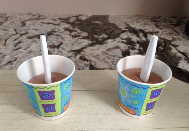 3. Pour the Nutella smoothie into a popsicle mould, or if you don’t have one, use little dixie cups. I broke up plastic knives to use as handles. Freeze!