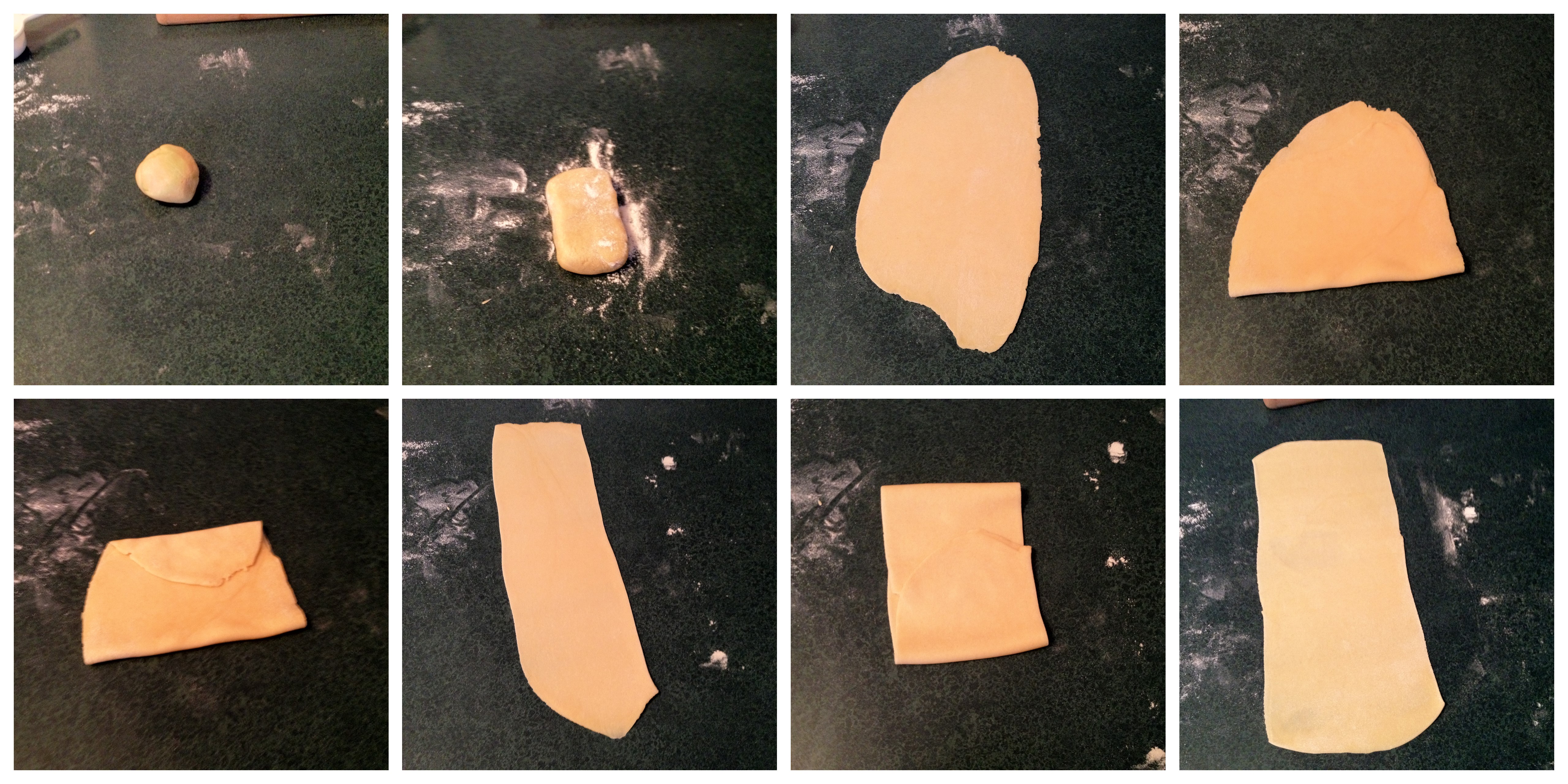 Roll it out into a nice flat, long shape and then fold it in thirds so that two of the rectangle’s edges are smooth. Now turn the rough edges so they’re on the side closet to you and furthest from you. Roll it out again into a long shape and then fold it into thirds again so that you have an entirely smooth rectangle. Roll out the dough one more time as flat and long as you can possible get it. If you have a pasta machine, ignore all these directions and do your thing, you lucky dog.
