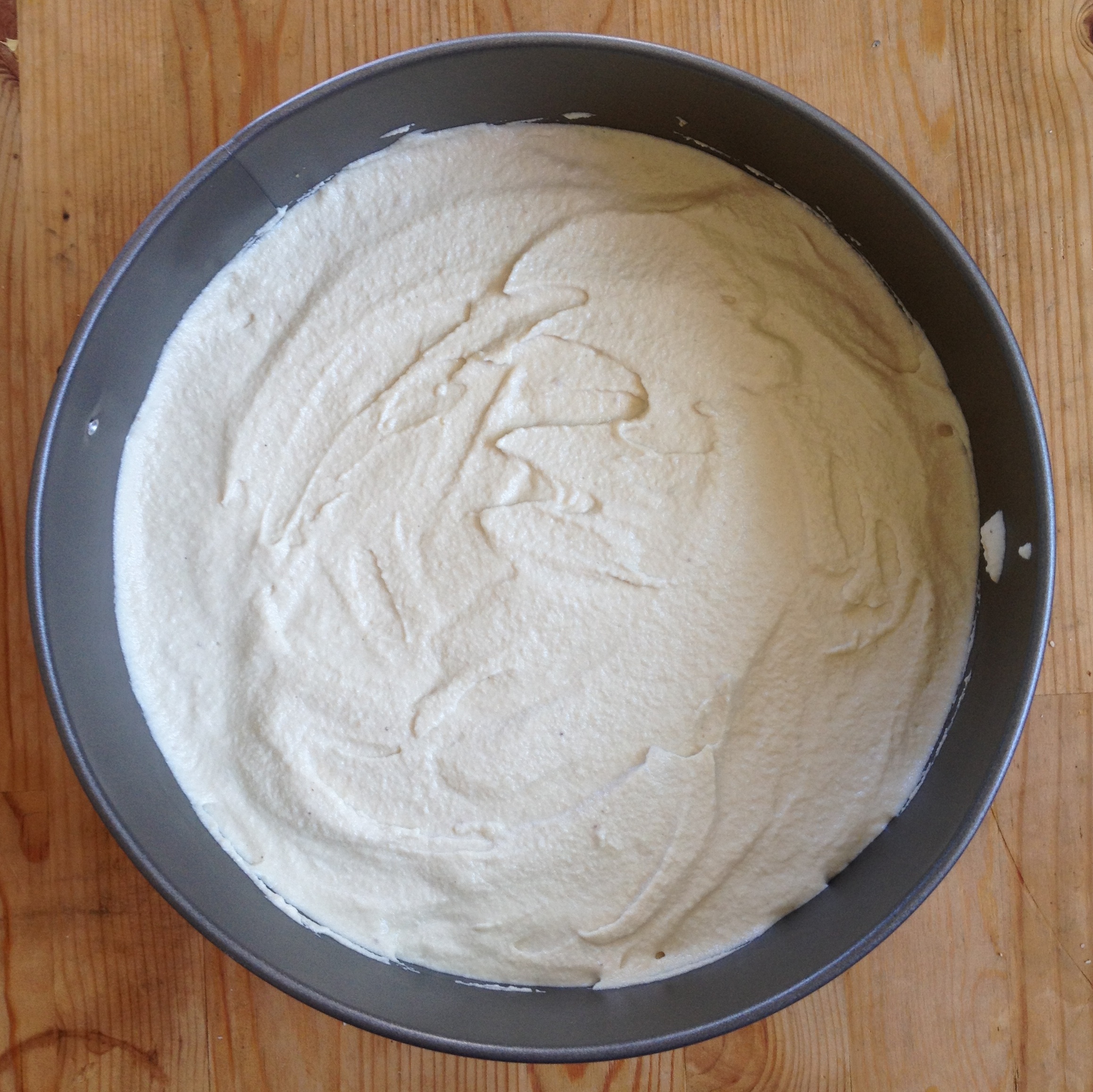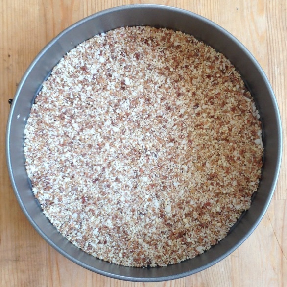 1. Sprinkle 1/4 cup of the coconut on the springform pan — or not, I like the little coconut shreds. Place the rest of the dried coconut, dates and almonds in a food processor and just go at it until it all looks evenly chopped. Chunky crust will take less chopping than a finer one, so chop the mix for longer if you’d like it to be smoother. The consistency of this crust is going to be crumbly, add more dates to the mix if you’d like it to be a little less so. Place the mix on the springform pan and pat it down evenly.
