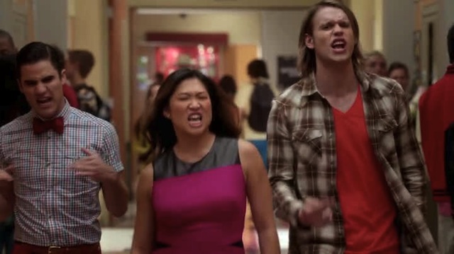We open in the Hallowed Hallways of McKinley High, where Blaine, Tina, and Sam are performing a sanitized version of “Jumpin’ Jumpin'”, apropos of nothing.