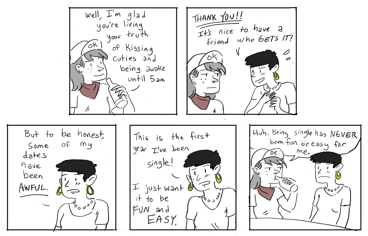 There’s something about this comic I find a little off- maybe I’m reading too much into it but it seems like the three dates are three stereotypes of terrible/misogynist lesbians or butch women (I’m assuming the person who doesn’t date bi girls is a lesbian given this is something of a terrible lesbian stereotype and most terrible straight guys find bi girls hot in a objectifying way). I’m not saying these types of people don’t exist, but it sucks to see a comic about queer dating where the people being mocked all appear to be from the exact same minority group within the queer umbrella.