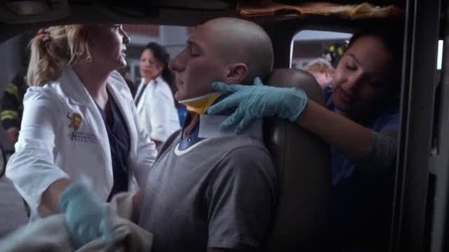 And then boom, we’re back on the scene in the parking lot. Teen boy is worried about getting in trouble with his mom over banging a girl inside of a minivan that was just impaled by a gurney. Callie is literally on the phone with his mom snitching and cackling. Or maybe she’s just being a good doctor, who knows? The jaws of life are used to pry the doors off of the minivan and free the teens.