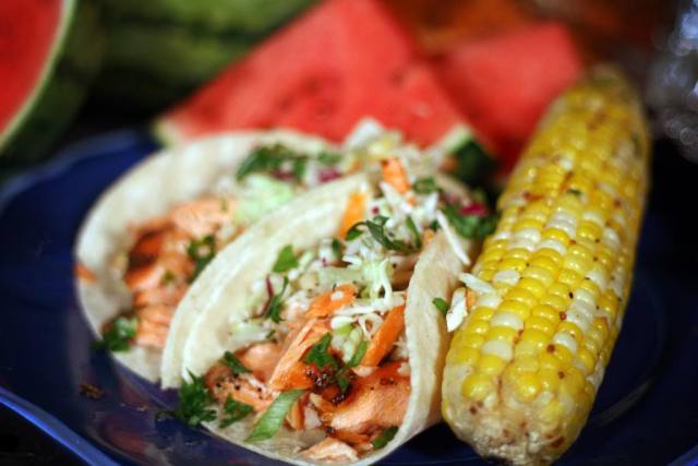 11. Sweet N’ Spicy Grilled Salmon Fish Tacos