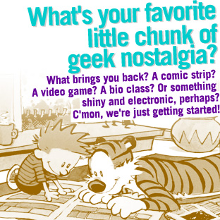 Calvin & Hobbes is certainly among my most beloved early brushes with geekdom, but I want to know: What’s your favorite little chunk of geek nostalgia? Or big chunk! Or like 25 chunks! Or a million little pieces!