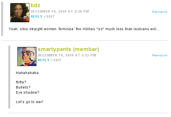 This week, DADT repeal happened. Apparently we were very excited because we talked about it a lot. We also talked about the new moving picture Black Swan a lot (again, I guess?), probably because Natalie Portman and Mila Kunis are hot or we all secretly wanted to be ballerinas when we were kids or something.