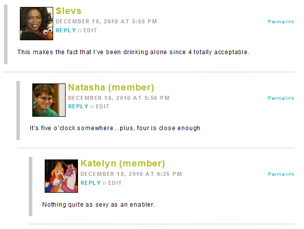 For the record, I don’t pay Emily off, except in the wit you see manifested in the comments themselves ;) There was even a week I didn’t win any, go Nancy Drew that shit if you don’t believe me ;)