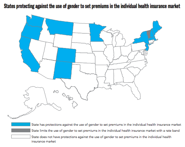 Although it’s hard to pinpoint why, exactly, gender rating occurs, it’s clear that pregnancy has nothing to do with it. The NWLC study excluded maternity coverage in their calculations and still found that a third of all companies charge 30-year-old women at least 30% than men. It wasn’t hard to eliminate those costs; only 6% of insurers even offer maternity coverage in states where it’s not mandated (that number rises to a whopping 12% when the 9 states where it’s required are factored in). According to the New York Times, companies claim the practice stems from a difference in the way men and women use health services.