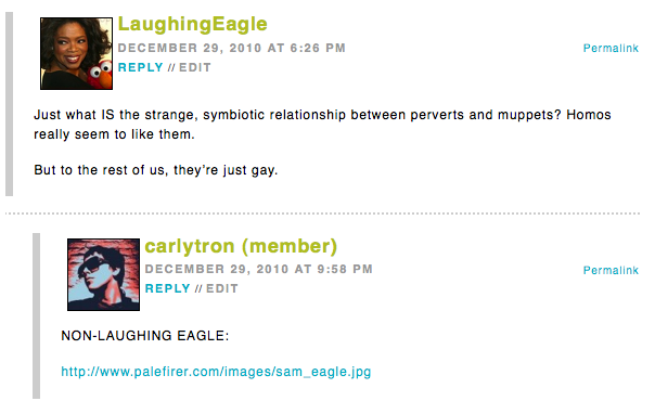 The Leave Britney Alone Award to Gabriel: “To HOMOSEXUALS Everywhere, Please leave Christmas and Santa Clause ALONE. Please keep the sickness of your evil perversions out of ALL holidays. Aren’t you all being sick enough???? Merry CHRISTmas (sarcastically).”