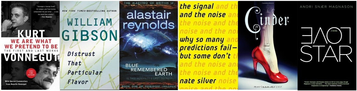 Know someone who gets all beamed up by science fiction? An English translation of Icelandic author Andri Snær Magnason’s wacky and prescient LoveStar ($12) was finally released last month (I haven’t read it yet, but this excerpt sold me, as did the fact that Magnason once wrote a book of poetry that was only sold in supermarket checkout lines). Then you have Marisa Meyer’s Cinder ($11), in which Cinderella is a cyborg; Alastair Reynolds’s Blue Remembered Earth ($18), in which an elephant expert is blackmailed into going to the moon; and the annual Nebula Awards showcase ($13), which is a grab bag of different-flavored electric gumballs. For those more into science fact, there’s Samuel Arbeson’s The Half Life of Facts ($13) (facts about facts! mind explosion!), Mark Henderson’s self-explanatory The Geek Manifesto ($18), 21st-century dreamboat Nate Silver’s The Signal and the Noise ($17), and Neuromancer scribe William Gibson’s first collection of journalism, Distrust That Particular Flavor ($18). If you’d prefer a little of both, pick up Kurt Vonnegut’s newest posthumous fiction allsorts, We Are What We Pretend to Be ($14) and his recently released collected Letters ($22). You can read one and give one to your girlfriend, and then swap when you’re done – it’s like literary boko-maru.