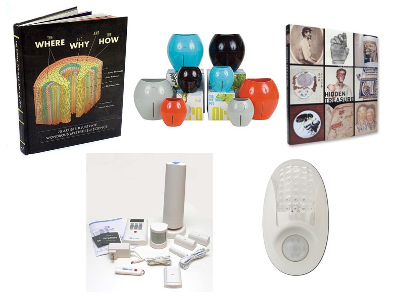If you know someone who’s constantly banged up in the shin area, maybe that person need a motion-sensing nightlight ($14). Your well-meaning but forgetful friend might like a self-watering plant pot ($34). Keep all your new gadgets safe with a portable wireless alarm system ($190) – it’s self-installable and customizable, and sends you security alerts on your smartphone. You’ll probably need a coffee table book to tie the room together – The Where, The Why and the How, in which artists illustrate 75 of science’s big unanswered questions, ($15), or Hidden Treasure, which collects photographs and drawings from the National Library of Medicine, will balance out all that chrome.