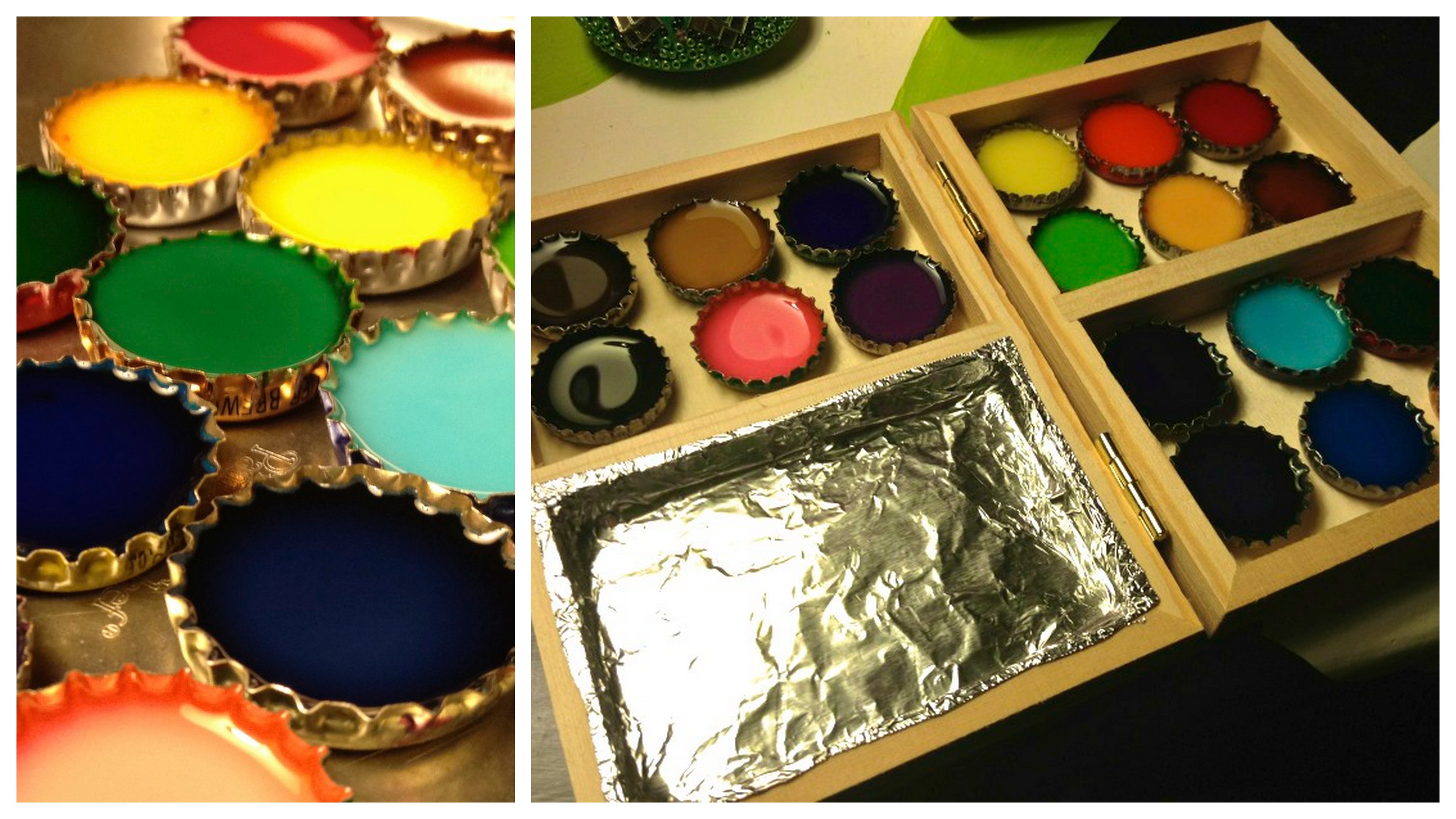 Before you start this project, you need to hunt down some bottle caps. If you don’t drink enough beer on your own, you can either go to a bar and ask them to save you bottle caps from the night for you or go to a restaurant that’s fancy enough to recycle and they will give you a million on the spot. Now onto the science: Combine the vinegar and baking soda and let the mixture sit until it stops bubbling. Add the cornstarch and corn syrup and stir it REALLY well. Spoon a small amount of the base into a bowl and dye it slightly darker than you want since it’ll lighten up as it dries. Pour the paint into a bottle cap and lather, rinse, repeat until you have all the colors you want. Wait a day or two for the paints to dry and then glue (preferably hot glue because it’s the most fun glue) the bottle caps of paint into whatever thing you’ve scrounged up. I lined the 4th compartment of my box with foil so that it can be filled with water and used with the paints.
