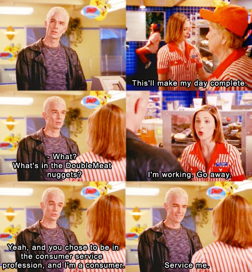 Remember when Spike went and visited Buffy at her job at the fast food restaurant? That was so cute. It’s always special when you’re trapped in a low-paying job which requires you to wear a profoundly stupid uniform and then your real friends from the real world come visit and catch you in all your uniformed scripted corporately-compliant glory.