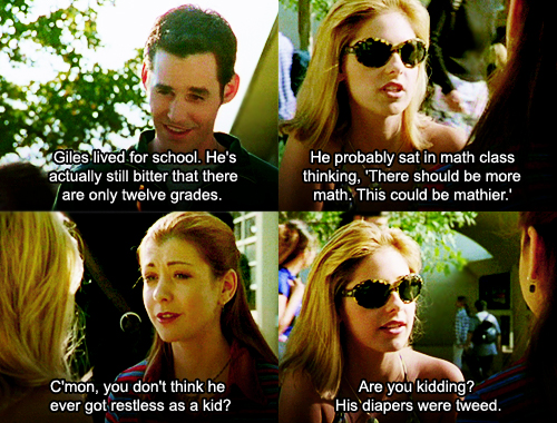 That being said, I’m not confident Buffy ever captured my entire attention at first, and by that I mean I was probs doing other things while watching, which likely contributed to my disenchantment. There was a monster of some kind, they killed it, then the episode was over. Everybody was dressed really bad and the special effects were almost comically terrible. None of the ongoing storylines snagged me — Angel seemed kinda broody and dumb, so I didn’t care about that, and Xander was obnoxious and Willow was talking in a weird baby voice all the time and I just kinda wanted to get a beer with Giles, and I don’t even drink beer. And maybe neither does Giles.