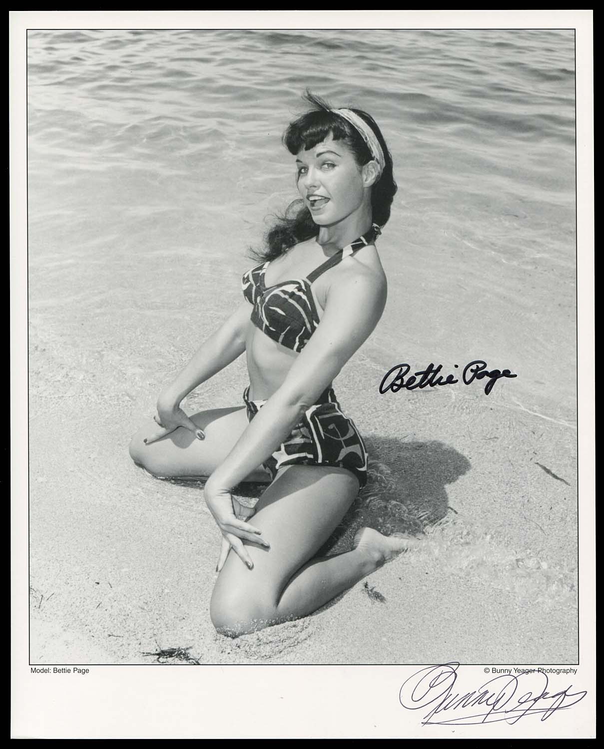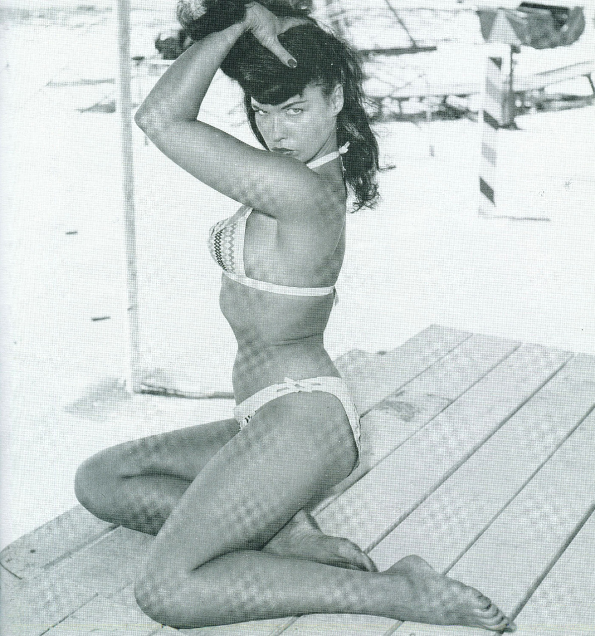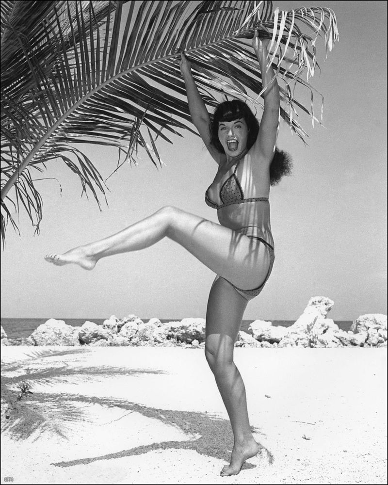 Bettie Page was born in 1923 on April 22, and by the fall of 1950 she was a (yawn) secretary. One day when she was casually walking along the beach alone (I’m melting) she met Jerry Tibbs, who became the first photographer of her new-fangled modeling career. A girl who used to pretend to be famous with her sisters as a teenager was living a fantasy of her own.